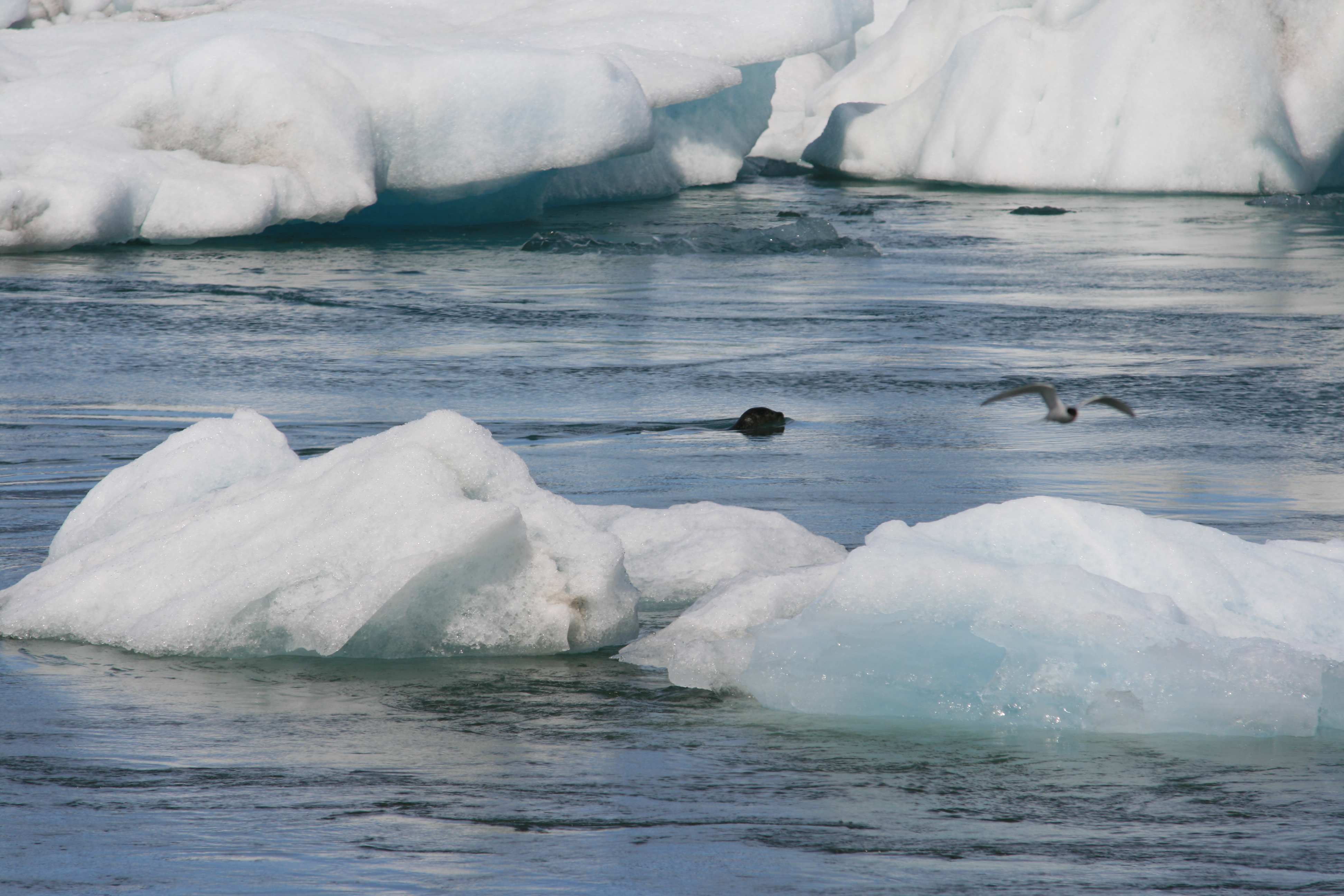 In der Gletscherlagune Jökulsárlón sind wir der Spezies der Raubmöwe begegnet. Die frißt den armen Küstenseeschwalben die Fische direkt aus dem Schnabel! Die Küstenseeschwalben stürzen sich wie abgeworfene Bomben ins Wasser, packen einen kleinen Fisch und flattern dann wieder hoch. Oben angekommen begeht die Raubmöwe dann Mund-… äh Schnabelraub. Auch Seehunde und diverse Wasservögel tummeln sich in dem eiskalten Wasser, das aus dem Gletschersee ins Meer abfließt. In the glacier lagoon Jökulsárlón we found a skua. It was stealing fish right out of the beaks of the arctic terns! The arctic terns fall like bombs into the water, grab some fish and fly back up. We saw some seals and some other water birds in the ice cold water, too.